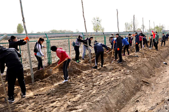 当日清晨,在呼和浩特市园林局工作人员的带领下来到植树现场,大家个个态度积极、热情高涨、兴致勃勃地投入到植树活动中。植树现场是一派紧张有序的劳动景象,三人成组,五人成团,大家有的扶苗,有的填土踩实,各个环节衔接有序,配合默契,真正是劲往一处使,汗往一处流,充分发扬了团结、互助、有爱的精神。公司领导班子身先士卒、奋战当先、干劲十足,起到了表率作用。经过一上午的挥汗奋战,134棵小树整齐的栽到了金盛道路旁,在四月的阳光中奏响绿色希望,圆满完成了这次植树任务,为宽阔的道路增添了一片生机勃勃的绿色